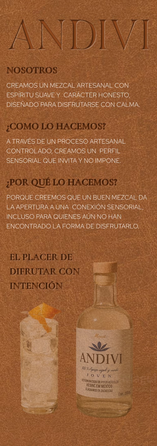 Es aquí donde nace Andivi, el mezcal que lleva el cielo en su nombre. “Andivi”, proveniente de la palabra “cielo” en lengua mixteca, es un nombre que evoca la idea de algo sublime, algo que trasciende la tierra y se conecta con lo divino.